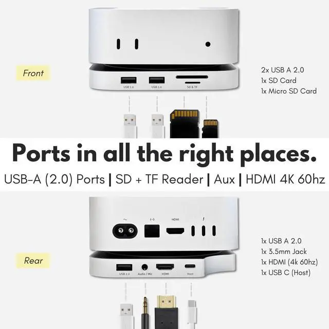FOR EVERYDAY DEVICES: Easily access 3 USB-A 2.0 ports, SD and TF card slots, an HDMI port (4K 60Hz), and a 3.5 mm audio jack via the m4 mac mini hub for your everyday devices. The mac mini m4 hub with complete slots.