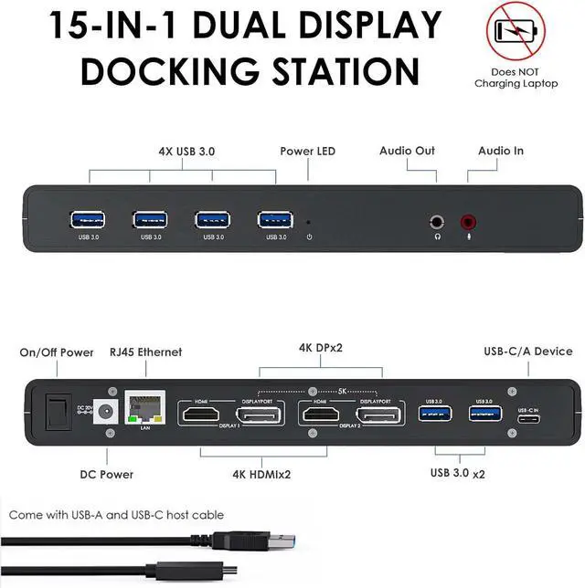 Flexible Expandability - This laptop docking station offers 2 HDMI or DisplayPort video outputs, wired Gigabit Ethernet, a 3.5 mm audio jack, and six USB 3.0 ports. It includes USB-A and USB-C cables for flexible host connections.