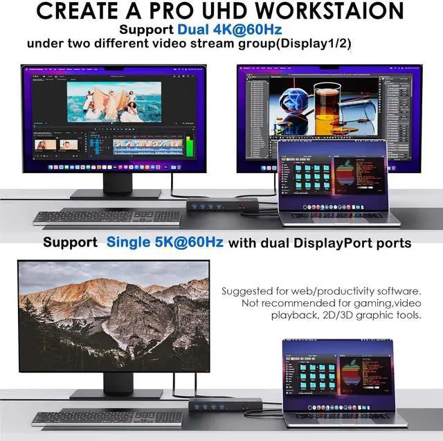 Dual 4K Monitors - Docking station equipped with dual HDMI 2.0 and DisplayPort 1.2 ports, allowing easy connection to two 4K monitors, each supporting resolutions up to 3840x2160 @ 60Hz. It also supports lower resolutions such as 2560x1440, 1080p and more.