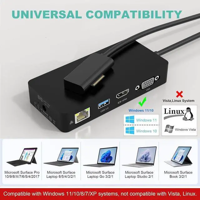Surface Dock Broad CompatibilityThis Microsoft Surface Laptop Docking station with surface connection technology, Surface Dock is widely compatible with Microsoft Surface Pro 10/9/8/X/7/6/5/4/2017, Microsoft Surface Laptop 6/5/4/3/2/1, Microsoft Surface Laptop Go 3/2/1, Microsoft Surface Laptop Studio 2/1, Microsoft Surface Book 3/2/1. 2024 New Microsoft Surface Dock is an indispensable companion for your busy work life.