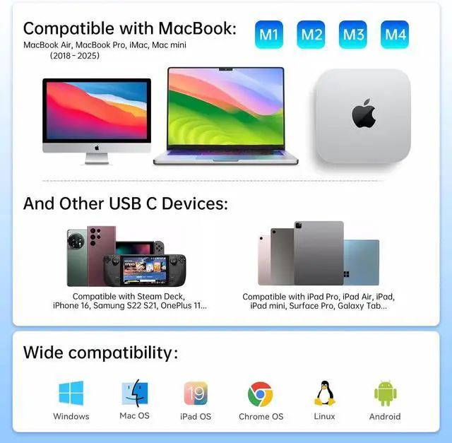 Strong Compatibility: The usb c hub ethernet support Windows, MacOS, Linux, and Vista system. Compatible with most usb-c devices such as Macbook pro Macbook Air 2024-2018 M1 M2 M3 M4 13 14 15 16, iMac, iPad pro, iPhone 15/16 Pro/Pro Max, dell xps 13 15 17, lenovo yoga, hp elitebook, surface pro, etc.