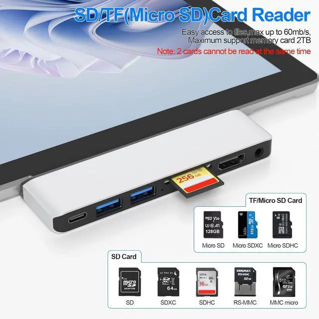 Pro 9 Adapter with High Speed Data Transfer: Type C Thunderbolt 4 supports 40Gbps data transmission, USB 3.0 port up to 5Gbps transfer. The built-in SD/TF (Micro SD) slot allows for easy access to files from SD/TF memory cards with a super speed of up to 480Mbps. Compatible with SDXC, SDHC, SD, MMC, RS-MMC, TF, Micro-SDXC, Micro-SD, Micro-SDHC, Mini-SD and UHS-I cards up to 2TB, allows you to transfer photos, videos, music and files quickly.