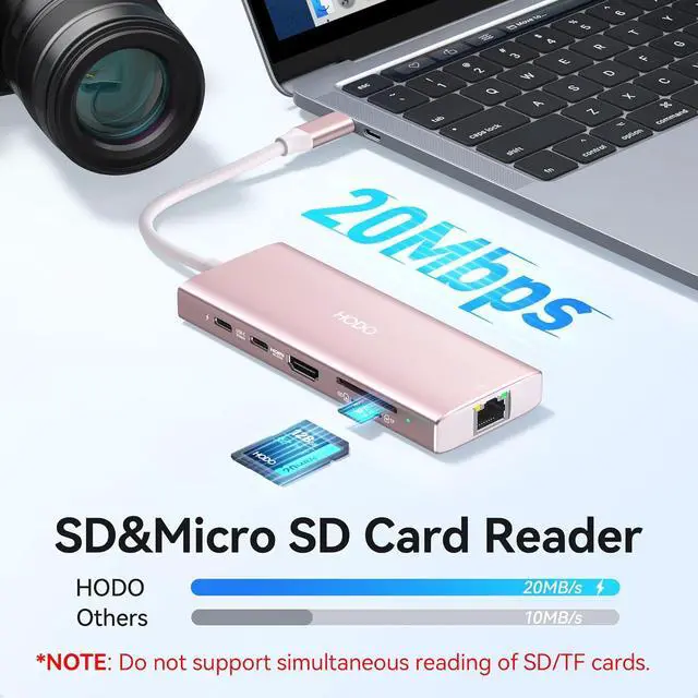 USB C Card Reader & 100W Power Charging Port: This usbc hub support you to charging your laptop at power up to 100W while connecting multiple peripherals, no need to worry about power storage; Also with this usb c to sd card reader, you can conveniently browse photos instantly on your USB-C smartphones/laptops and transfer hundred photos in seconds to your laptop.
