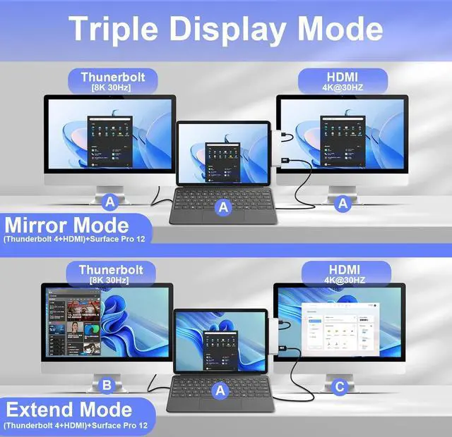 Triple Display Mode for Unmatched Productivity: This Surface Pro 12 adapter supports a stunning triple-display setup (4K HDMI + 8K Thunderbolt 4 + your Surface Pro 12 screen). Mirror or extend your displays to manage multiple applications effortlesslyideal for stock traders, programmers, designers, and anyone who needs to multitask like a pro. Output to 4K@30Hz via HDMI or breathtaking 8K@30Hz via the Thunderbolt 4 port.