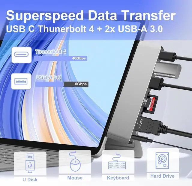 Blazing-Fast 40Gbps Data Transfer & 100W Charging: Experience unparalleled speed! The Surface Pro 12 USB C hubs Thunderbolt 4 port delivers lightning-fast data transfer at 40Gbpsperfect for moving large files in seconds. Simultaneously, it provides 100W PD pass-through charging to power your device and keep it at 100%. The dual USB 3.0 ports offer 5Gbps speeds, and the dedicated SD/TF card readers make photo and video editing a breeze for creators.