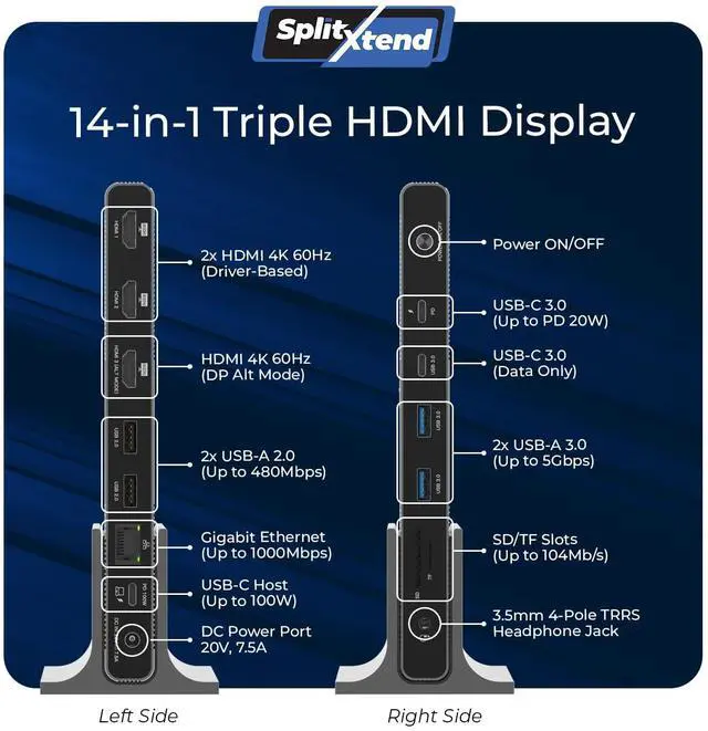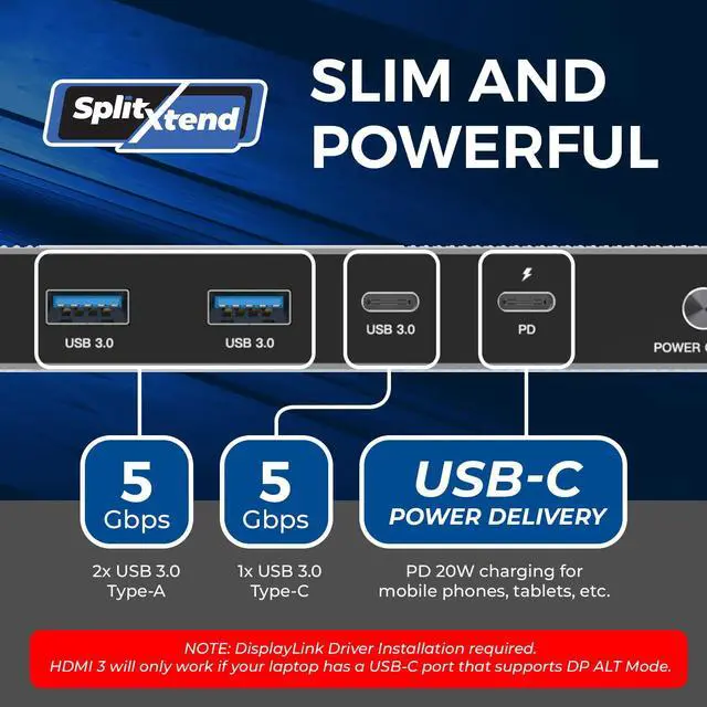 One cable solution This SplitExtend 14-in-1 DipslayLink Docking Station comes with 3x HDMI ports, SD/TF card port, AUX port, 6x USB ports (2x USB 2.0 & 4x USB 3.0 ), and a Gigabit Ethernet port & 100W PD for your laptop and 20W for phones/accessories. Connected to your laptop via a single USB-C cable (Included)