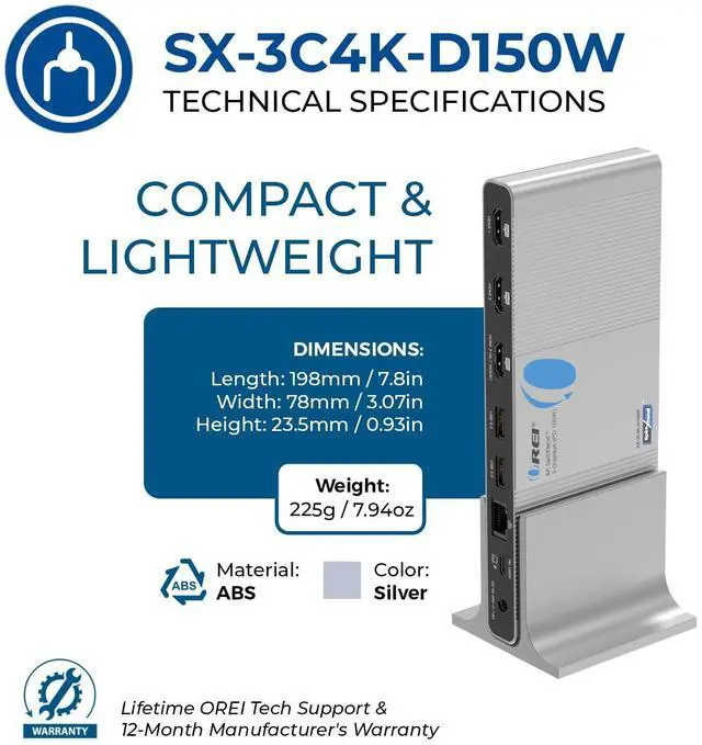 3 Monitor Docking Station package includes USB-C Cable, Stand/Base, 150W Power Adapter, User manual, and the DisplayLink Docking Station 3 monitors. Backed by a 1-year Manufacturing support and Lifetime Tech support from OREI