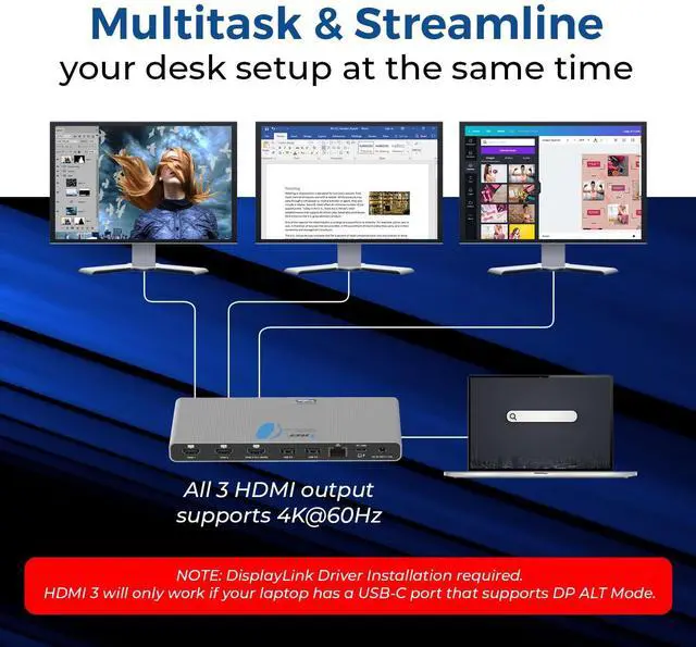 OREI Triple Monitor Docking Station 3x HDMI ports, 2x work with Display Link Driver installation, and the third port works only if your laptop/PCs USB-C port supports video (MST via DP Alt mode/Thunderbolt)