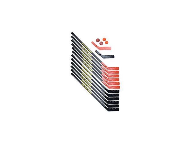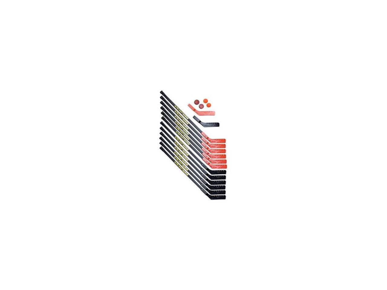 - Includes 12 sticks (six black and six red); two no bounce balls (orange); two pucks (red); and two extra blades (red and black).