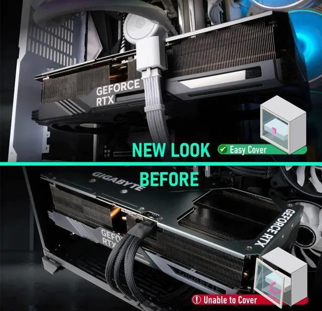 Clean Space: This graphics card power steering connector has been completely upgraded to optimize the cable line management system, beautify the graphics card power routing, improve the overall wiring effect, keep the inside of the chassis clean and tidy, and solve the installation problem of the case cover".
