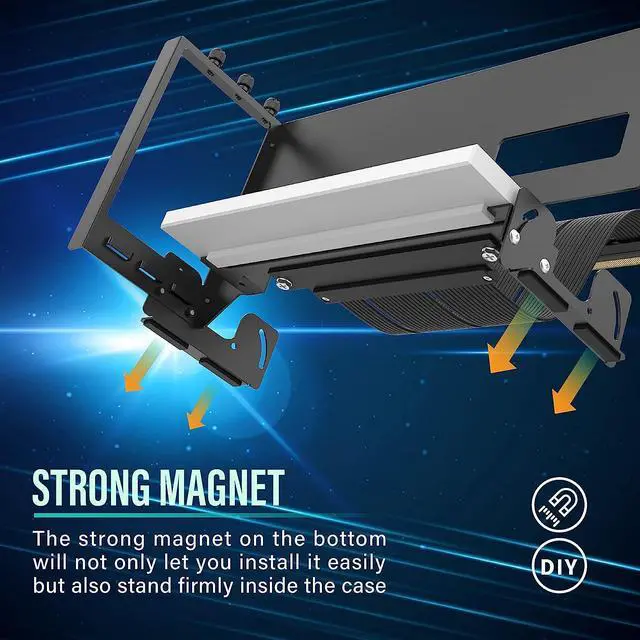 The adjustable GPU bracket allows to show off their GPUs and enhance cooling efficiency by mounting it vertically, or at an angle between 0 and 45 degrees, on the PSU shroud or any metal surface.