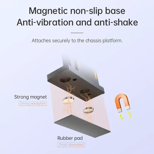 Magnetic Base: This GPU support is designed with magnetic base and rubber soft pad. Simply place the bracket on the chassis iron plate below the graphics card to firmly adsorb. The rubber pad prevents scratches and reduces vibration.