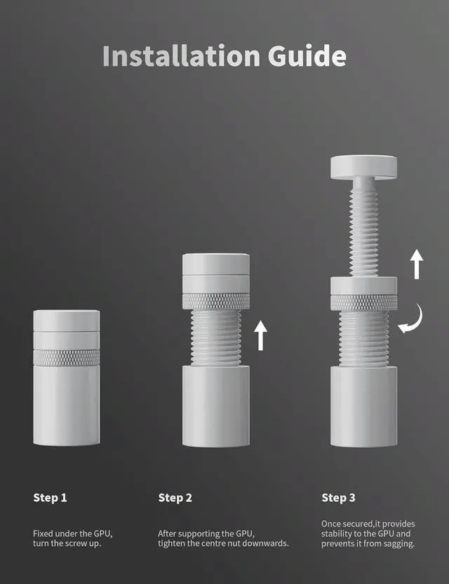 Easy-to-Use and Effective Solution: Quickly adjust the height of the anti-sag bracket by twisting the nut and placing it between the case and your GPU Card. Minimum support height is 26mm, maximum support height is 50mm.