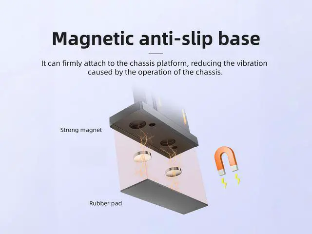 Magnetic Base This GPU stand features a magnetic base and rubber padding design. Simply place the stand on the metal plate of the case beneath the graphics card and it will securely attach. The rubber pad prevents scratches and reduces vibrations.