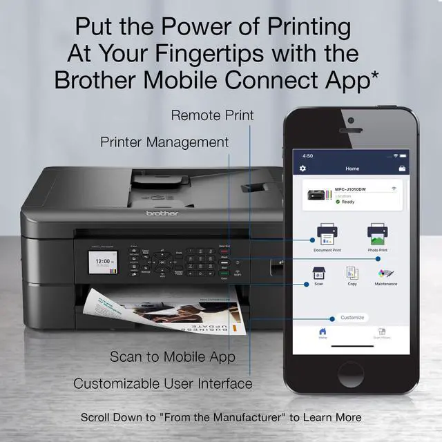 PUT THE POWER OF PRINTING AT YOUR FINGERTIPS: The simple to use Brother Mobile Connect (1) App delivers easy onscreen menu navigation for printing, copying, scanning and printer management from your mobile device