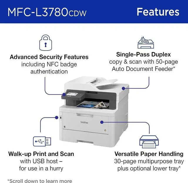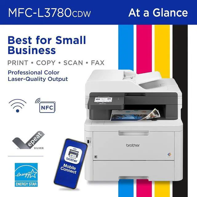 Best for Small Businesses,the Brother MFC-L3780CDW wireless multi-function digital color printer with copy, scan, and fax functionalities consistently produces pristine, laser-quality output on every page