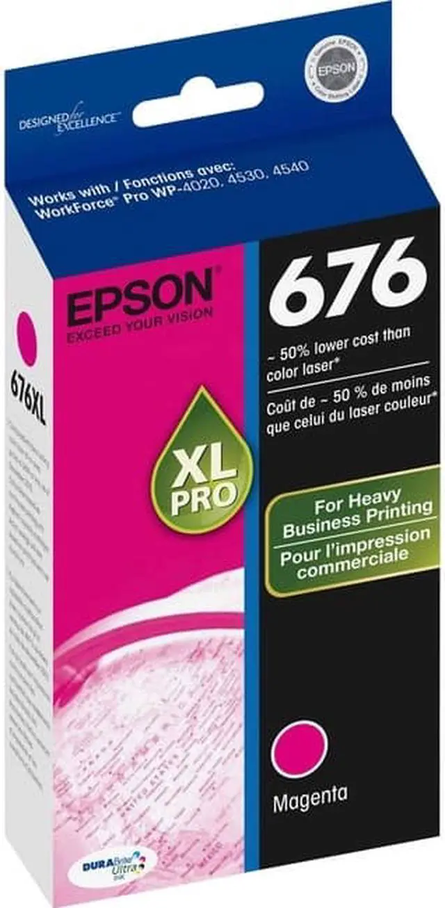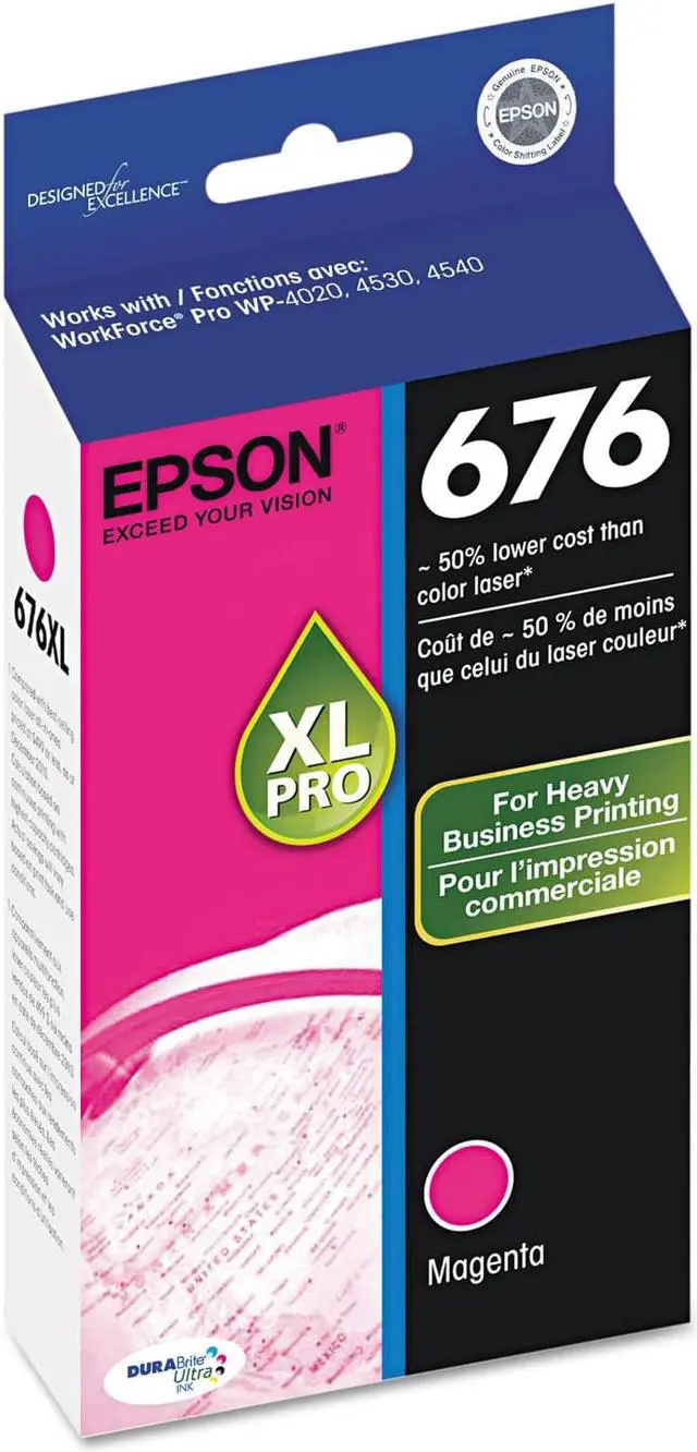 Keep papers free of smears, streaks and smudges by using this Epson 676XL high capacity magenta ink cartridge.