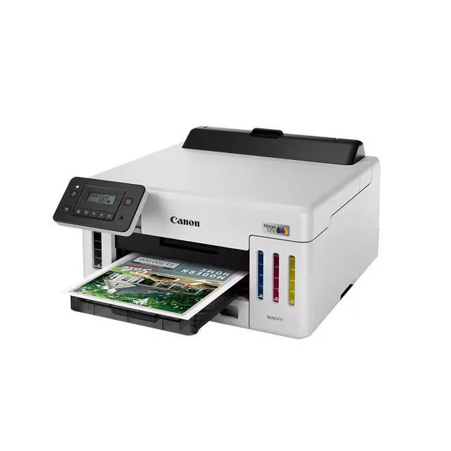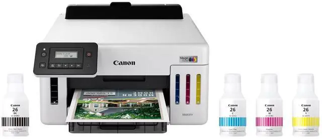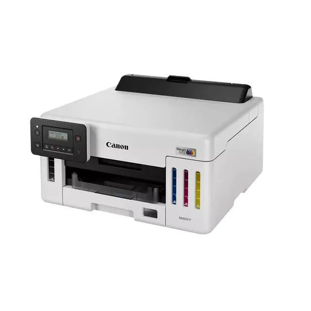 Designed for home offices and small businesses, the Canon MegaTank GX5120 delivers high-quality, low-cost printing, and outstanding wireless connectivity in a compact size. Get serious print productivity with a high page yield of up to 6, 000 Black & White / 14, 000 Color pages per full ink bottle set and a low cost per print of less than 2 cents per page. Each printer comes with a full set of ink so you can print with confidence. FeaturesUp To 2 Years of Ink IncludedPerfect for low-cost, high-volume printing. Up to 2 years of Canon genuine ink bottles included in the box.