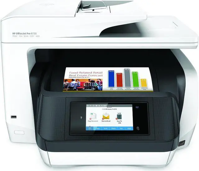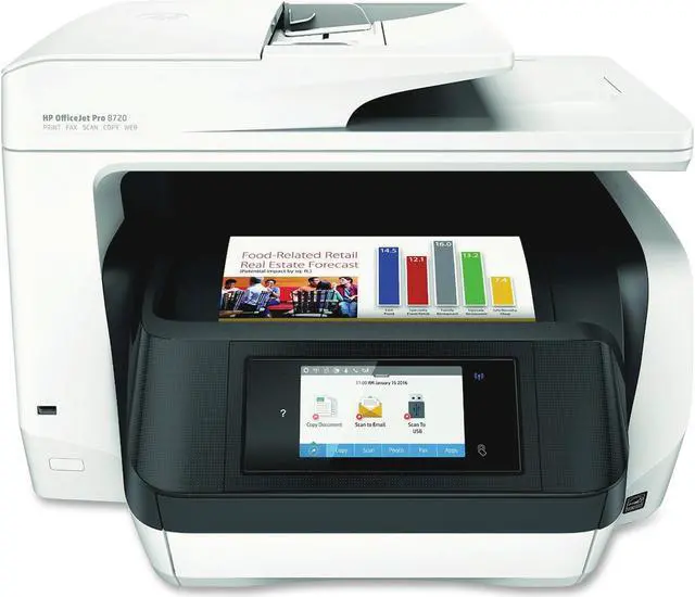 All-in-one printer is engineered for small workgroups that need professional-quality, affordable color and versatile all-in-one capabilities. 4.3" touch-screen display lets you effortlessly manage print jobs directly at the printer. Cost-efficient design uses high-yield cartridges to let you print up to three times more pages and replace cartridges less often. Super-fast, two-sided printing lets you speed through large, multipage print jobs. Increase your paper capacity to 500 sheets with the included second 250-sheet paper tray. Wireless technology lets you easily print from your mobile devices without accessing the company network, from anywhere in the office. JetAdvantage Private Print helps protect your confidential print jobs. All-in-one printer also features a 600 MHz processor speed, 512MB memory, NFC touch-to-print and more.