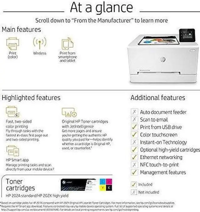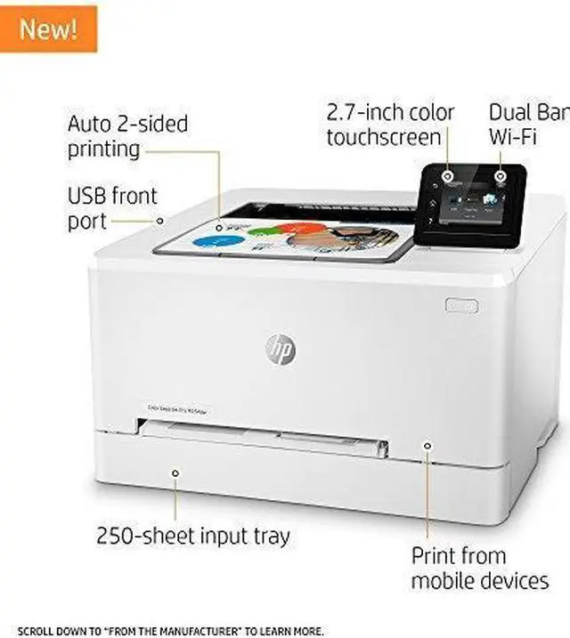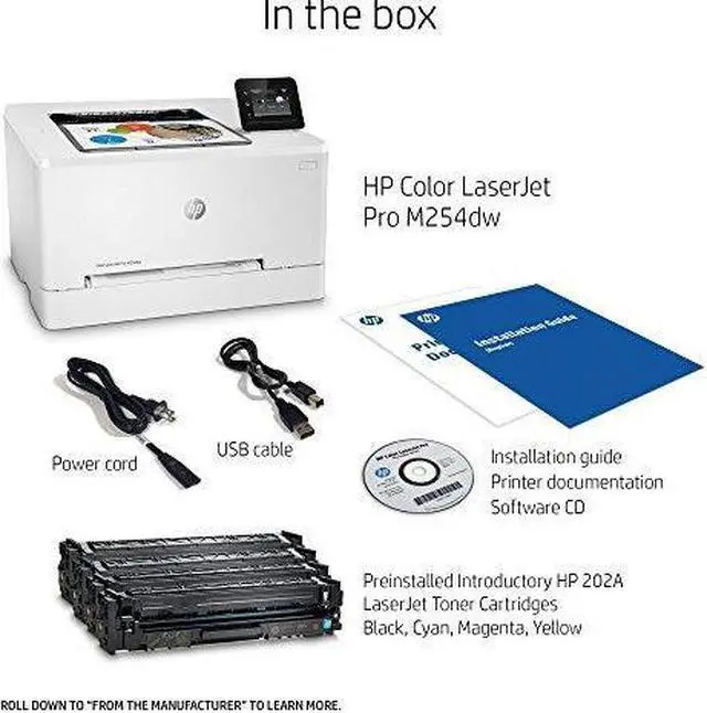 Brand: HPFeatures: BIG PERFORMANCE IN A SMALL PACKAGE - This compact color laser printer features fastest in-class two-sided printing and first page out plus mobile and wireless printing USB port and a 2.7-inch color touchscreenFAST PRINT SPEEDS - Prints up to 22 pages per minute black/color first page out as fast as 10.2 sec black and 11.8 sec color input tray paper capacity up to 250 sheetsEASILY PRINT FROM YOUR MOBILE DEVICE - Simply connect your iOS or Android device to the same network as your printer to print or print without a network using Wi-Fi DirectTHE POWER OF YOUR PRINTER IN THE PALM OF YOUR HAND - The HP Smart app allows you to easily set up your printer scan from your smartphone order toner and print from the cloud-such as iCloud Dropbox and Google DriveWIRELESS CONNECTIVITY YOU CAN COUNT ON - Have confidence in your connection with steady performance from dual band Wi-Fi plus Ethernet capability for wired networkingMORE PAGES PERFORMANCE AND PROTECTION - Count on high-quality color and more pages than before with Original HP Toner cartridges with JetIntelligenceChoose Original HP 202A toner cartridges for great results print after printFor toll-free HP technical support dial 1(800) 474-6836. Select Technical Support Printer then LaserJetOperating System: WindowsPublisher: Hewlett Packard Inkjet PrintersRelease Date: 2017-09-11Details: Designed for work teams of 1â10 individuals who want the latest solutions to improve business efficiency the HP Color LaserJet Pro M254dw allows you to print high-quality color documents quickly and conveniently. With the fastest in-class two-sided printing speed and first page out plus an intuitive touchscreen easy mobile printing and a reliable wireless connection this printer has your office printing needs covered. Pair it with the HP Smart app and you have the power to scan documents on the go with your smartphone camera and print from the cloud using iCloud Dropbox or Google Drive.UPC: 190780192795EAN: 0190780192795