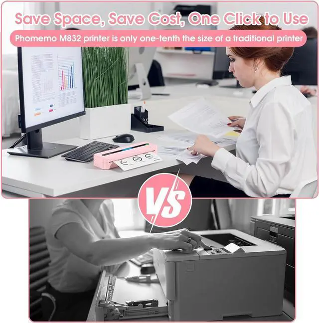 Phomemo Upgrade Portable Printer with Paper Bin: Phomemo M832 portable printers wireless for travel weigh only 1.5lb, 80% smaller in size and weight than traditional printers. The portable thermal printer easily fits in your backpack or briefcase! M832 compact no ink printer is mobile printers for vehicles, suitable for car, truck, business trip, small office, university, home use. This wireless portable printer has a built-in roll paper bin, no need to carry printing paper separately