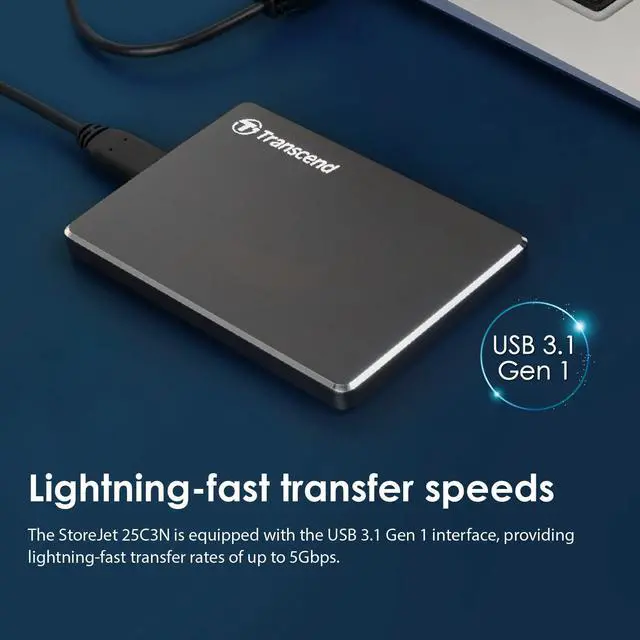 • The StoreJet 25C3N is equipped with the USB 3. 1 Gen 1 interface with the support of UASP (USB Attached SCSI Protocol), providing lightning-fast transfer rates of up to 5Gbps