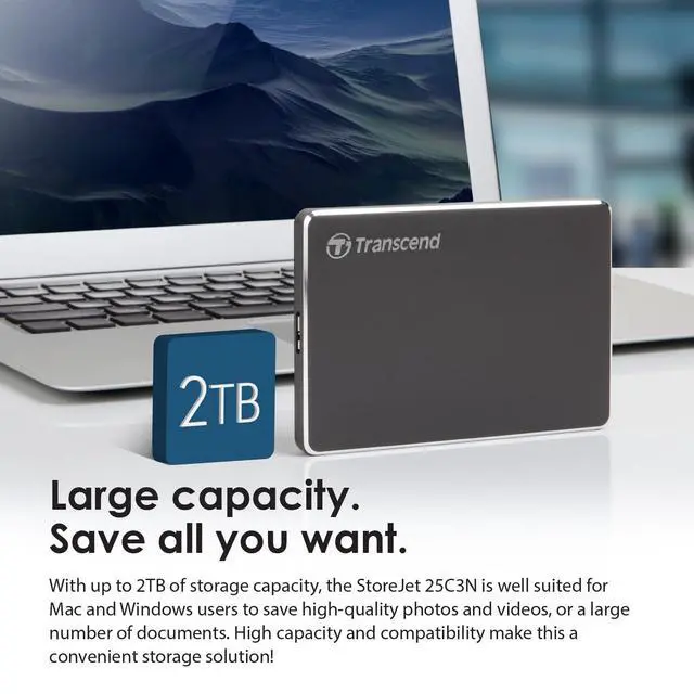 • While slim, the StoreJet 25C3N comes in high Capacities of up to 2TB, so you can store and back up all of your files