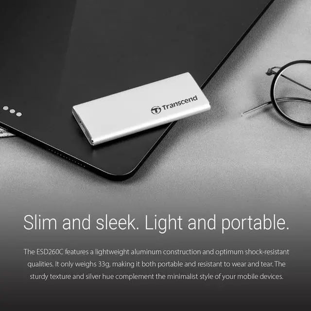 rnTranscend's ESD260C is a portable solid state drive featuring a sturdy metallic case in a silver hue, a USB 3.1 Gen 2 interface for unmatched transfer rates, and a USB Type-C port. In addition, the ESD260C only weighs 33g, which is convenient to carry around.