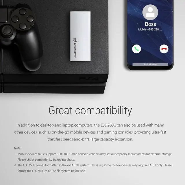 In addition to desktop and laptop computers, the ESD260C can also be used with many other devices, such as on-the-go mobile devices and gaming consoles, providing ultra-fast transfer speeds and extra large capacity expansion.