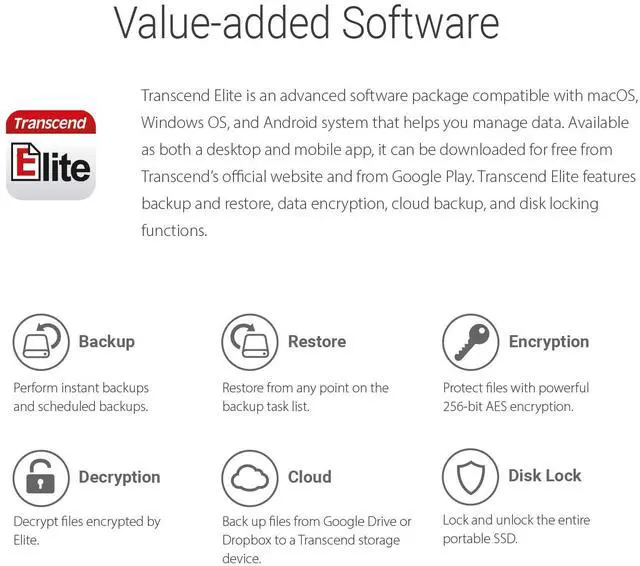 Transcend Elite is an advanced data management software package compatible with macOS, Windows OS, and Android. Available as both a desktop and mobile app, it is a free download from Transcend’s official website and from Google Play. Transcend Elite features backup and restore, data encryption, cloud backup, and disk locking functions.