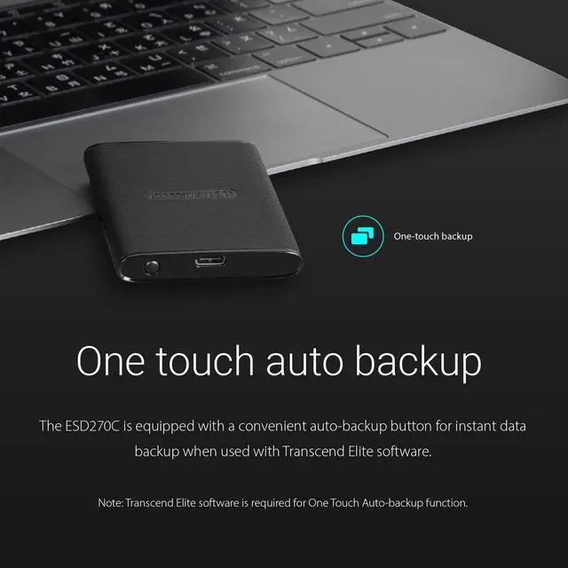 The ESD270C is equipped with a convenient auto-backup button for instant data backup when used with Transcend Elite software.