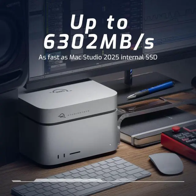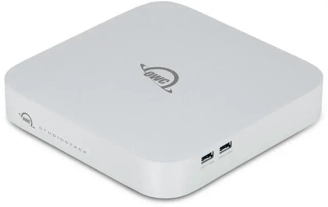 OWC StudioStack is the worlds first Thunderbolt 5 dual-drive hybrid storage and connectivity hub that perfectly stacks with Mac Studio and 2018-2023 Mac minis. It offers up to 64x MORE storage capacity vs 512GB Mac Studio machines, up to 6302MB/s speed that rivals the latest Mac Studios, and a six port Thunderbolt/USB-A hub for additional connectivity possibilities. StudioStack maximizes the efficiency of photo/video/CGI/audio workflows, enables AI engineers and data scientists to easily run and store large LLMs, helps general users expand their storage capacity while matching the performance and design of their Mac Studio, and assists anyone wanting to add several Thunderbolt displays to a Mac Studio and expand the machines built-in storage.