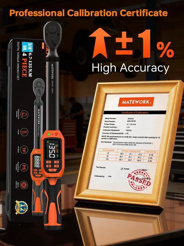 ±1% High AccuracyPrecision-engineered 3/8 torque wrench digital sensor delivers ±1% accuracy across 5-99.5 ft-lb / 6.7-135 Nm range. Real-time LCD displays torque in multiple units. Hardened CR-V steel core withstands shop use. ASME-traceable certificate included