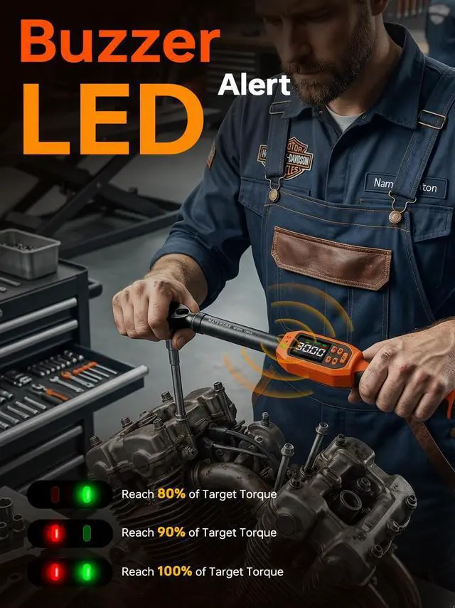 Progressive LED & Buzzer AlertGreen at 80% Red at 90% Both flash with buzzer at 100%giving clear visual and audible warnings when spec is reached. The bright color LCD screen ensures easy reading in low-light conditions, helping prevent over-tightening damage