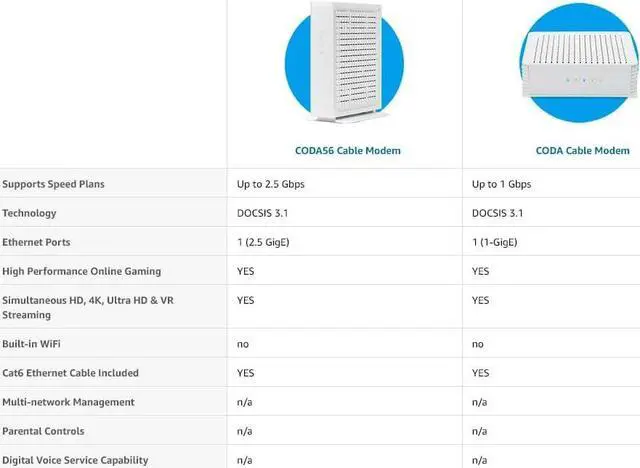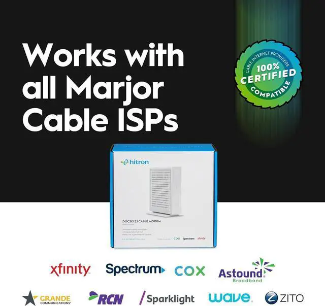 Hitron's CODA56 DOCSIS 3.1 cable modem is compatible with cable Internet service plans up to 2.5 Gbps, including Comcast Xfinity, Charter Spectrum, Cox Gigablast, Astound, Grande, RCN, Wave and Zito Media. Compatible with the Xfinity app to self-activate and get online faster without needing a service call. Not compatible with Verizon, AT&T, CenturyLink, DSL providers, DirecTV, DISH and any bundled voice service.