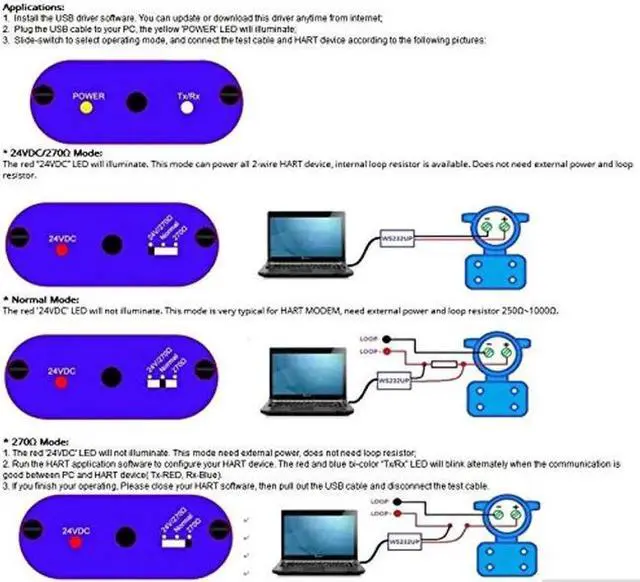 2. Run the HART application software to configure your HART device. The red and blue bi-color Tx/Rx LED will blink alternately when the communication is good between PC and HART device( Tx-RED, Rx-Blue).
