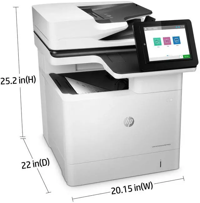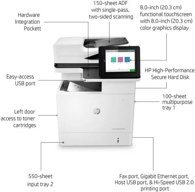 http: //www. hp. com/learn/dsFeaturesThe worlds most secure printingWith HP Sure Start, operating code is automatically checked at startup and repairs itself if compromised. High-speed performance meets energy efficiencySpeed through tasks and save paper. Print two-sided documents nearly as fast as single-sided. Performance and protection you can count onProduce sharp text, bold blacks, and crisp graphics with precision black toner. Give workgroups the speed they needHelp workgroups capture every page easily and detect potential errors or missed pagesevery time. Compatible Supplies J8J96A HP Staple Cartridge Refill; J8J87A HP LaserJet 110V Maintenance Kit; J8J88A HP LaserJet 220V Maintenance Kit; J8J95A HP 300 ADF Roller Replacement KitMinimum system requirements2 GB available hard disk space, Internet connection, or USB port, Internet browser. For additional OS hardware requirements see microsoft. comWhat's in the box? HP LaserJet Multifunction Printer; HP Black Original LaserJet Toner Cartridge (~ 10.5K yield); Documentation (Hardware Install Guide, Regulatory Flyer); Power cord. Disclaimers HPs most advanced embedded security features are available on HP Enterprise and HP Managed devices with HP FutureSmart firmware 4.5 or above. Claim based on HP review of 2019 published features of competitive in-class printers.