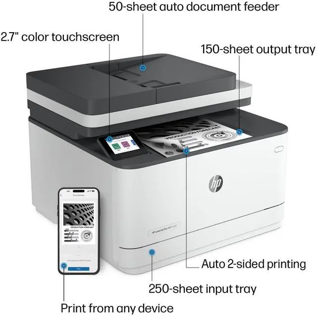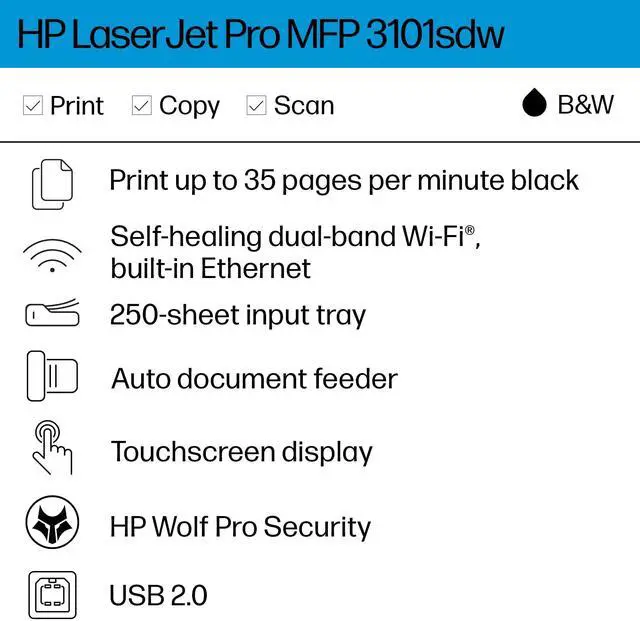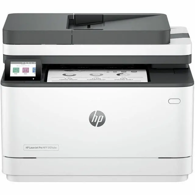 HP LaserJet Pro 3101SDW Wired & Wireless Laser Multifunction Printer - Monochrome - Copier/Printer/Scanner - 28 ppm Mono Print - 1200 x 1200 dpi Print - Automatic Duplex Print - Up to 50000 Pages Monthly - Color ADF, Flatbed Scanner - Fast Ethernet Ethernet - Wireless LAN - HP Smart App, Apple AirPrint, Mopria, Wi-Fi Direct - USB - For Plain Paper Print