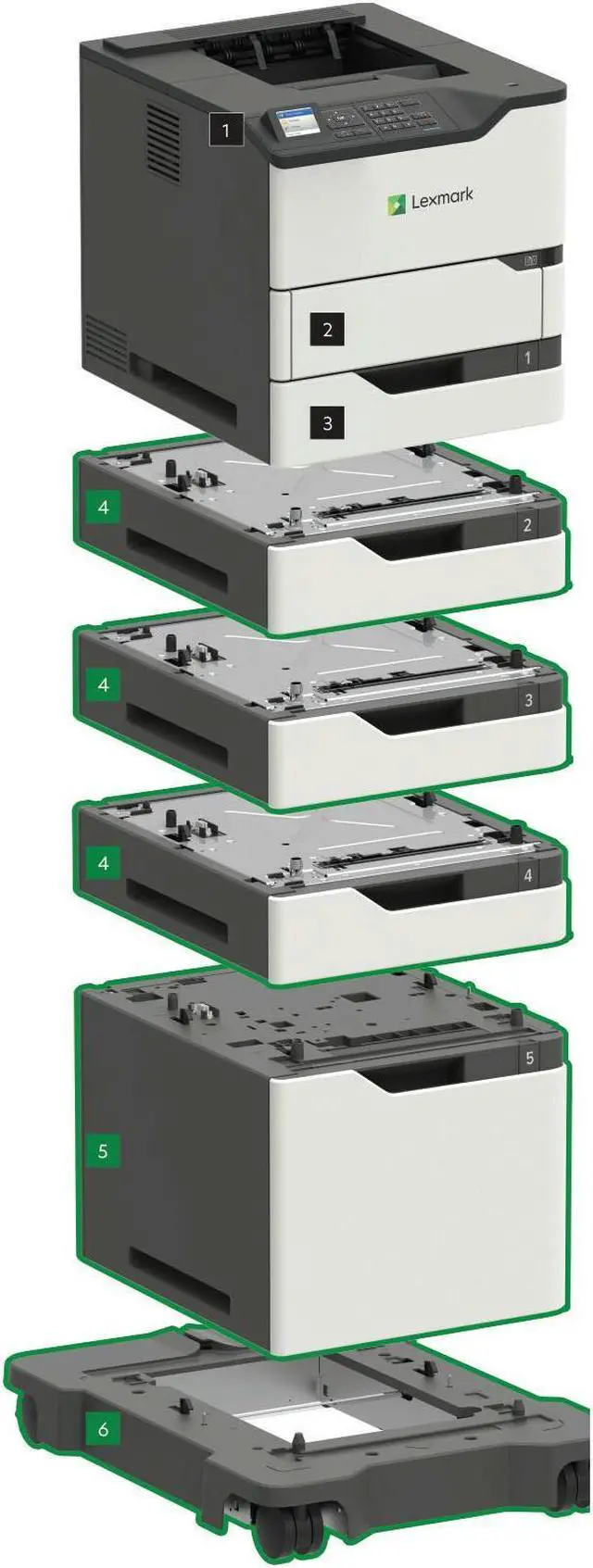 The Lexmark MS825dn features a first page as fast as 4 seconds, output up to 70 pages per minute, and two-sided printing.