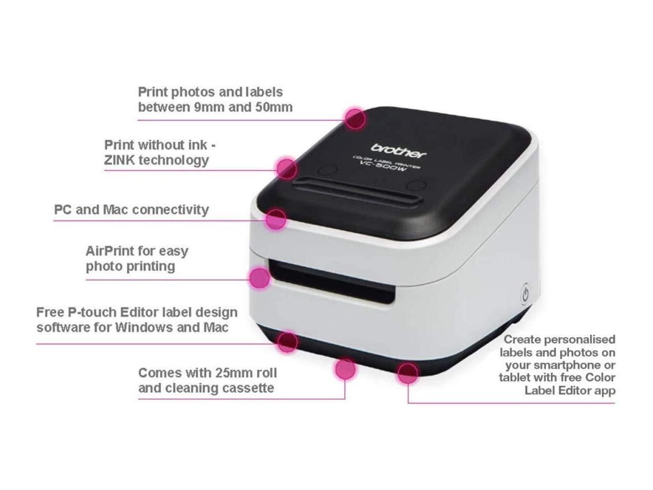 - Print without ink: The Brother VC-500W compact color printer uses ZINK Zero Ink Technology to deliver rich, vivid full color without ever requiring ink. All the colors needed for high-quality photo printing are embedded in the adhesive-backed ZINK paper.