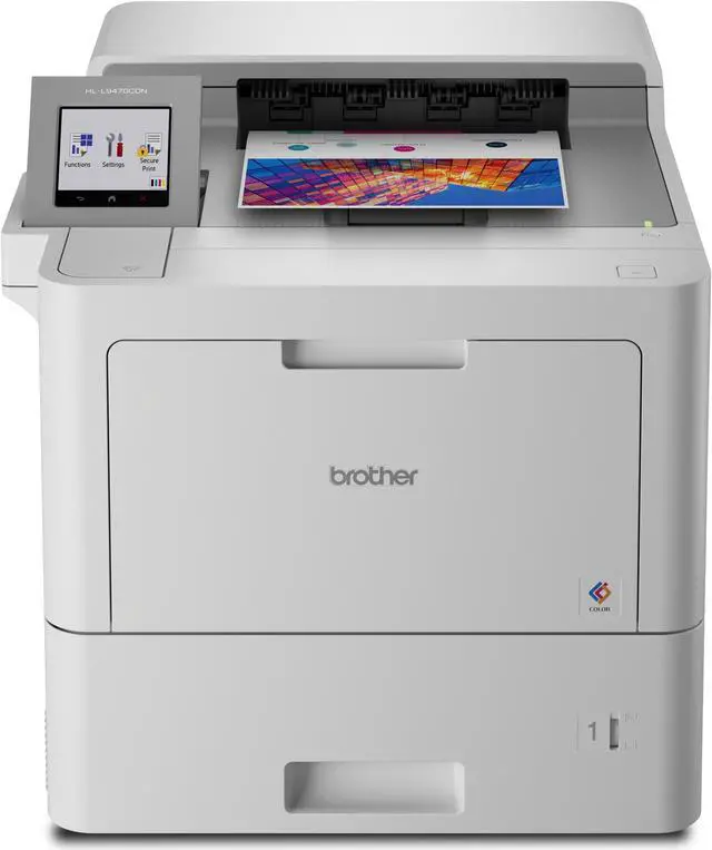 The Brother Workhorse HL-L9470CDN Enterprise Color Laser Printer is designed for how work now works: providing enterprise-level performance, advanced security features, and reliable output. Offers built-in value with included Brother Genuine 9,000-page black and 6,500-page color toner cartridges. Delivers the lowest laser color cost per page ever from Brother by using the TN815 super high-yield replacement toner cartridges for 15,000 pages black and 12,000 pages color. Simplex and duplex print speeds up to 42 ppm and a 3.5 color touchscreen. Advanced security features. 620-sheet total standard paper capacity. Gigabit Ethernet and dual band (2.4GHz / 5GHz) wireless networking. Easily print from mobile devices. Maximum Print Speed (Black): 42 ppm; Maximum Print Speed (Color): 42 ppm; Print Resolution (Black) (Width x Height): 2400 x 600 dpi; Print Resolution (Color) (Width x Height): 2400 x 600 dpi.
