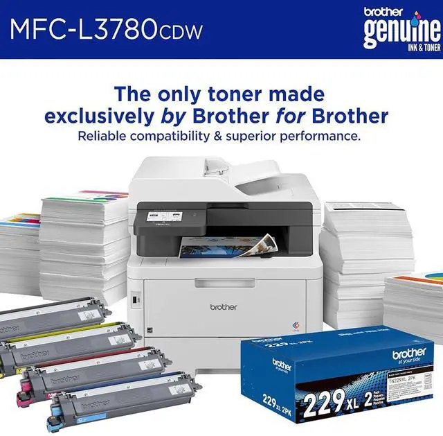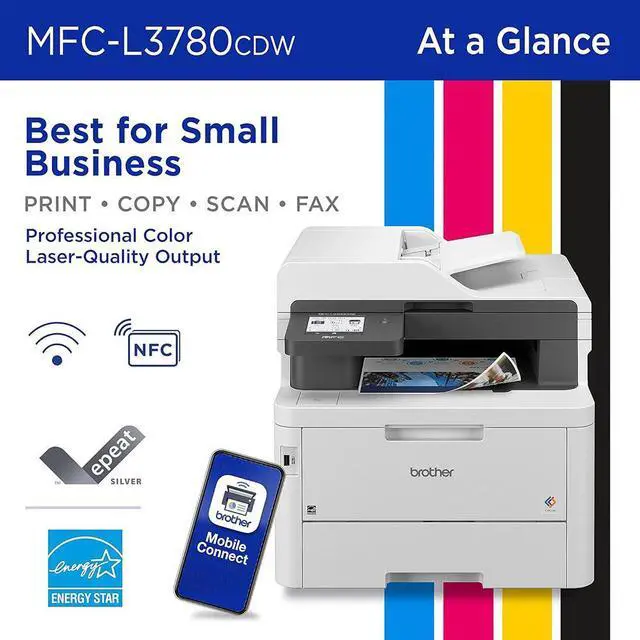 Laser PrinterProduct Description: The Brother MFC-L3780CDW is a powerful wireless all-in-one color printer built for high-performance productivity. Designed for home offices and small businesses, it offers fast print speeds up to 31 pages per minute in both black and color. The MFC-L3780CDW delivers advanced features like single-pass duplex scanning and copying, automatic two-sided printing, and a 3.5 -inch color touchscreen for seamless navigation and direct cloud access. It supports a wide range of connectivity options including dual-band Wi-Fi, Gigabit Ethernet, Wi-Fi Direct, USB, and NFC. With a 250-sheet paper tray, a 30-sheet multipurpose tray, and a 50-sheet auto document feeder, this printer can handle a variety of paper types and sizes. It’ s also compatible with Brother’ s Refresh EZ Print Subscription Service to help ensure you never run out of toner.