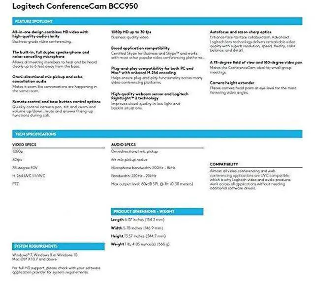 Brand: LogitechColor: BLACKFeatures: Features professional HD video with superior speakerphone audio for simple small-group conferencingCarl Zeiss Optics with Autofocus deliver razor-sharp images and allow detailed visuals to be shared close-up . Microphone Bandwidth: 200 Hz - 8 kHz78-degree field of view and 180-degree remote-controlled video pan tilt zoom ensure whole group visibilityAll-in-one design combines HD video with high-quality audio clarityThe built-in full duplex speakerphone and noise-cancelling microphone. Allows all meeting members to hear and be heard clearly up to 8 feet away from the base.Omni-directional mic pickup and echo cancellation audio. Makes it seem like conversations are happening in the same room.Remote control and base button control options. Quickly control camera pan tilt and zoom and volume up/down mute and answer/hang-up functions during call.Broad application compatibility. Optimized for Microsoft Lync and Skype and works with most other popular UC platforms.Hardware Platform: pcLegal Disclaimer: Manufacturers warranty 90 Days or longerPublisher: LogitechWarranty: 2 year limited warrantyDetails: The first all-in-one video and audio conferencing system for small groupsView larger Logitech ConferenceCam BCC950 Small group video conferencing has arrived everywhere. Now you can instantly transform any office or meeting space into a business-grade small group video conference room. Logitechâs ConferenceCam BCC950 is the first all-in-one video and audio conferencing device designed with small groups in mind. It combines a freestanding wide-view HD webcam with an enterprise-quality speakerphone in one easy-to-use computer-connected device. Small groups can run their own video conferences anywhere in the office without huddling around PC webcams or competing for time on overbooked conference room systems. Setting the Standard The award-winning ConferenceCam BCC950 is making high-quality group video conferencing more affordable and accessible to businesses of all sizes. Business-grade HD video Experience desktop video meetings so clear and razor sharp youâll feel like youâre face-to-face in the same room. With 1080p HD video at a smooth 30 frames per second precision autofocus a premium Carl Zeiss lens and advanced auto light correction everyone in the room can be clearly seen in professional high-quality videoâeven in low light or backlit conditions. View larger Professional Speakerphone The built-in full duplex speakerphone&mndash;and integrated omni-directional microphone with both noise and echo cancellationâallow everyone in the group to hear and be heard clearly up to eight feet away from the ConferenceCam. A wider field of view perfect for group meetingsView larger Full-room View A 78-degree field of view and 180-degree video pan ensure that each member of the small group is seen in your meetings. You have far more freedom to move around the room interact together and show presentation materials than you would with the limited field of view of built-in computer webcams. Pan tilt zoom and control audio with included remoteView larger Versatile Voice & Video Control With the included remote control and console buttons you can instantly pan tilt and zoom the camera to focus on the entire team the meeting leader or detailed close-ups of whiteboards documents design layouts and product demonstrations.