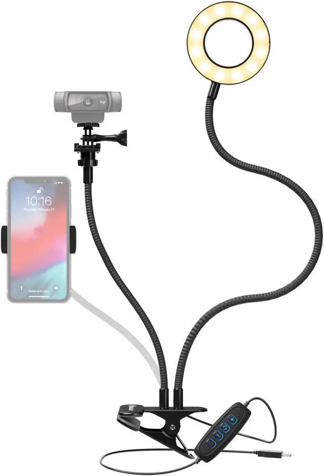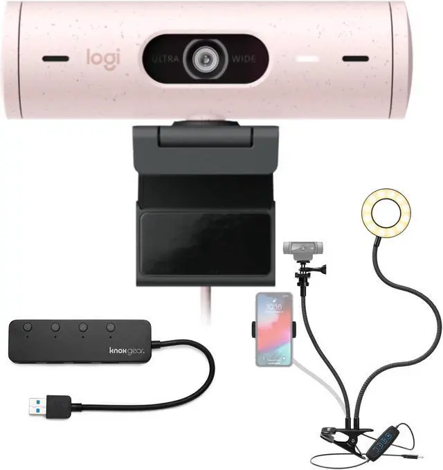 Show Mode: Present your work or other objects on your desk with Show Mode, which lets you tilt the web camera up or down with one hand Dual Noise Reduction Microphones Be heard clearly in noisy environments thanks to noise canceling mics that filter out background sound during calls Webcam with Privacy Cover To protect your privacy between meetings, simply rotate the integrated webcam privacy shutter to completely block the camera 90-Degree Field of View A wider-than-normal FOV gives you extra space to move around or have a second person on the camera with you; use Logi Tune to zoom in or out to a full 90º width Logi Tune Pair with Logi Tune to customize your Logitech Webcam experience; zoom in or out, mute the microphone, adjust color and image resolution, manage auto-frame, and set automatic updates Knox Gear Selfie Ring Light Stand with Interchangeable Cell Phone Holder and Webcam/Camera Mount The Knox Gear Multipurpose Webcam Holder and Light Stand is a 2-in-1 selfie ring light with phone holder. It acts as a stand for streaming live videos from your cell phone, and the ring light adds a touch of professionalism to your setup.