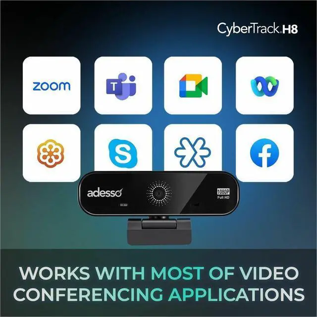 1080P ( 2.0 Megapixel), H. 264, Auto focus Webcam with build in Dual Microphone & Privacy ShutterAdesso's CyberTrack H8 is a 1080P Full HD Resolution Desktop Webcam that allows you to record and share colorful vivid HD quality video with fine detail. This webcam offers you broad Instant Messenger compatibility, so you can enjoy video conferencing with today's most popular Instant Messenger applications. This webcam also includes an integrated wide-angle microphone that lets your voice be heard loud and clear, whether you are chatting with loved ones or doing business on a video call.