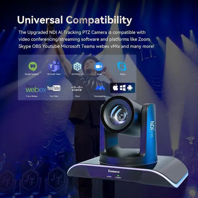 The IP Live Streaming Camera can be compatible with the current popular video/streaming software, including Zoom, Skype, YouTube, WebEx, BlueJeans, Facebook, Teams, Facetime, Google Hangout, OBS, Google Meet and and video production software which supports NDI HX. It supports Windows 7/ 8.1 /10/11, Mac OS 10.10, Linux, Android or higher. The streaming camera is also widely used at online courses, church live broadcasts, Tele-Medicine, Studio streaming, High-Tech Conference, large events, etc.