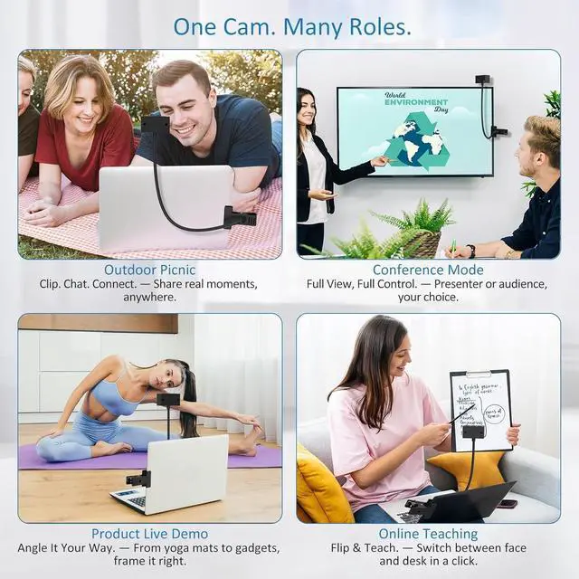 Flexible Selection of PC Camera Position and AngleThe pc camera's adjustable Gooseneck and camera clamp allow you to get ideal shoot for video conferencing, sharing documents and live presentations. Webcam clamp fits Desks,Tables,Sideboards,and Monitor,max thickness of 3.5cm(1.38inches). the webcam for pc built-in a adjustable stand,the compact design allows the webcam to be securely positioned above or below TVs where you can fine-tune the angle to suit your set-up.