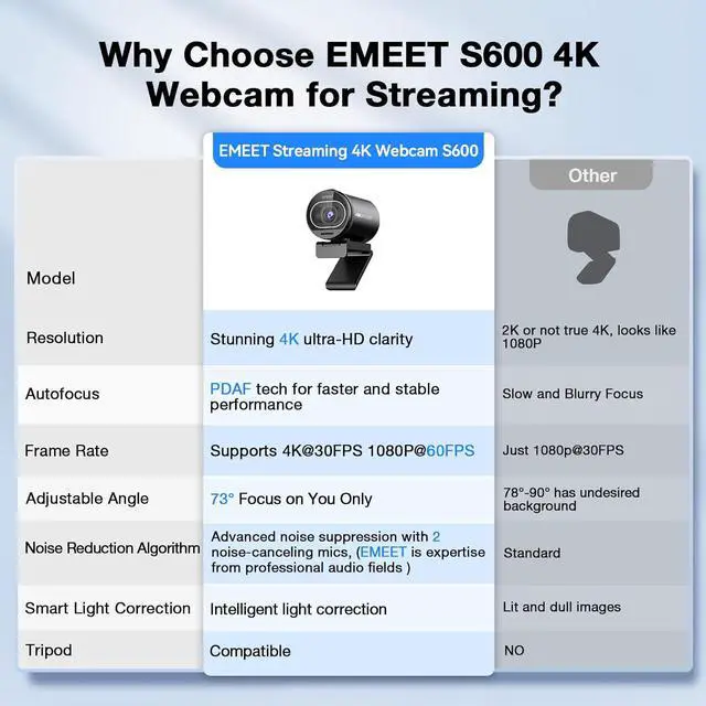 Advanced PDAF Autofocus & Light Balance 4K webcam S600's PDAF(Phase Detection Autofocus) tech offers significant advantages over common autofocus such as faster speed, higher precision, and more stable performance in various scenes features. Its auto light adjustment capability balances shadows and highlights even in low-light environments, keeping every detail sharp and clear on screen, making it ideal for content creators and live streamers who demand top-tier performance and visual quality.
