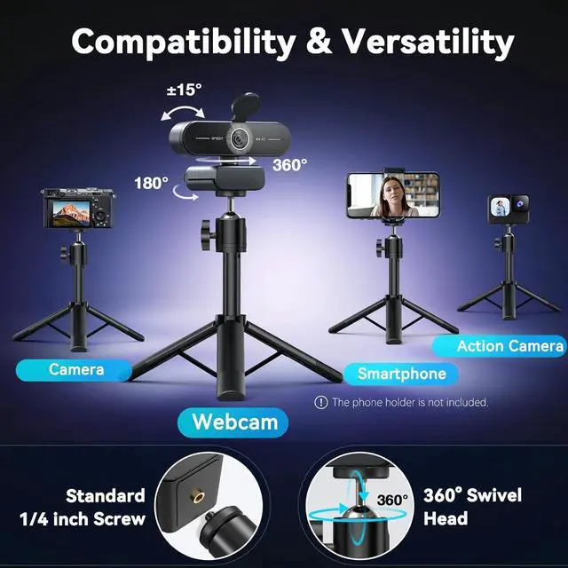 High Compatibility Tripod - The tripod of this 4K webcam for PC comes with a universal joint, supporting 360° rotation and flexible viewing angle, making it very suitable for live streaming scenes with multiple movements. Equipped with a 1/4-inch screw, the EMEET C60E webcam with tripod seamlessly pairs with various devices, including webcams, phones, cameras, and Action cameras. It facilitates diverse daily needs like live streaming, video recording, gathering moments, and online meetings.
