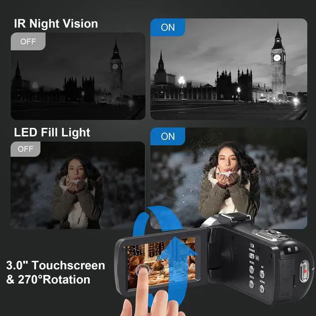 IR Night Vision & Fill Light FunctionEquipped with infrared night vision capability, this camcorder allows for capturing clear black and white photos and videos in low-light environments. The vlogging camera also features a fill light function to ensure natural, high-definition images. Additionally, the infrared night vision 8K camera comes with a microphone, enabling relatively clear sound even in noisy environments.